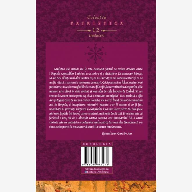 Multora nici măcar nu le este cunoscut faptul că există această carte, nici cel ce a scris-o și a alcătuit-o. De aceea am judecat să-mi dau silința mai ales pentru ea, ca să-i învăț pe cei necunoscători și ca să nu fie uitată și ascunsă o asemenea comoară. Căci poate să ne folosească nu mai puțin decât înseși Evangheliile; de atâta filozofie, de corectitudinea dogmelor și de minuni este plină în chip arătat și mai ales de cele lucrate de Duhul. Să nu trecem de acum încolo peste ea, ci să o cercetăm cu migală!  E cu putință a afla aici și dogme, care, de nu era cartea aceasta, nu s-ar fi făcut cunoscute nimănui așa de limpede, ci începătura mântuirii noastre s-ar fi ascuns și ar fi fost nearătată în privința viețuirii și a dogmelor. Cea mai mare parte din cele puse aici sunt faptele lui Pavel, care s-a ostenit mai mult decât toți. Și pricina este că fericitul Luca, cel ce a alcătuit cartea aceasta, era învățăcelul lui, a cărui virtute este cu putință a o vedea din multe părți, dar mai ales din aceea că s-a ținut nedespărțit de învățătorul său și l-a urmat totdeauna.