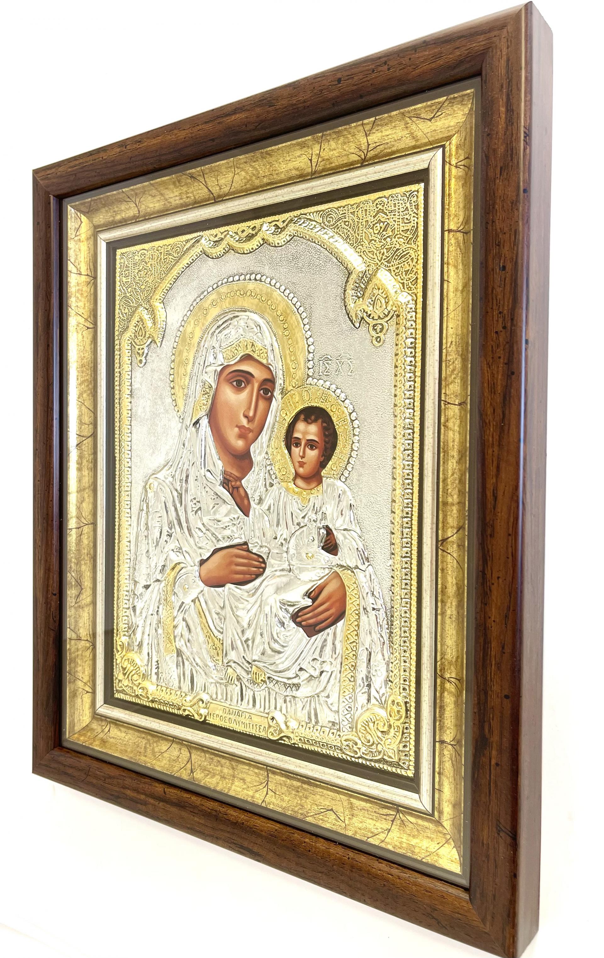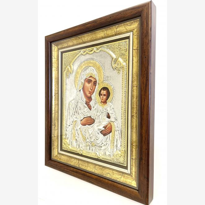 Icoană argintată, cu ramă din lemn si sticlă