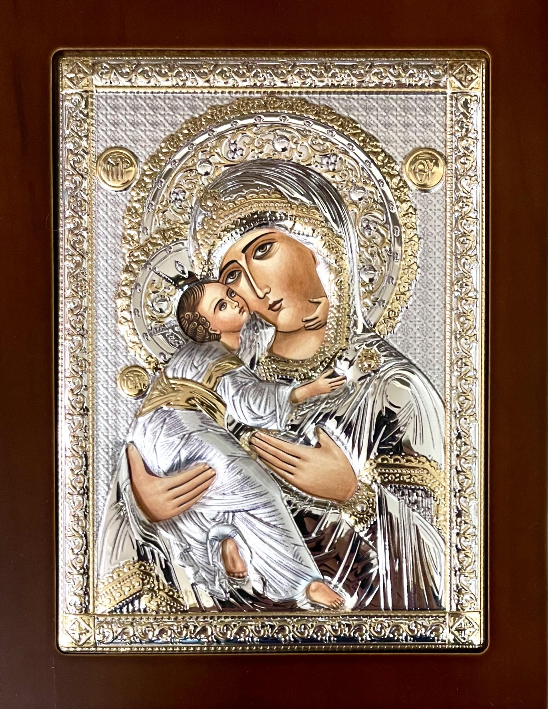 Icoană argintată  cu suport de lemn.