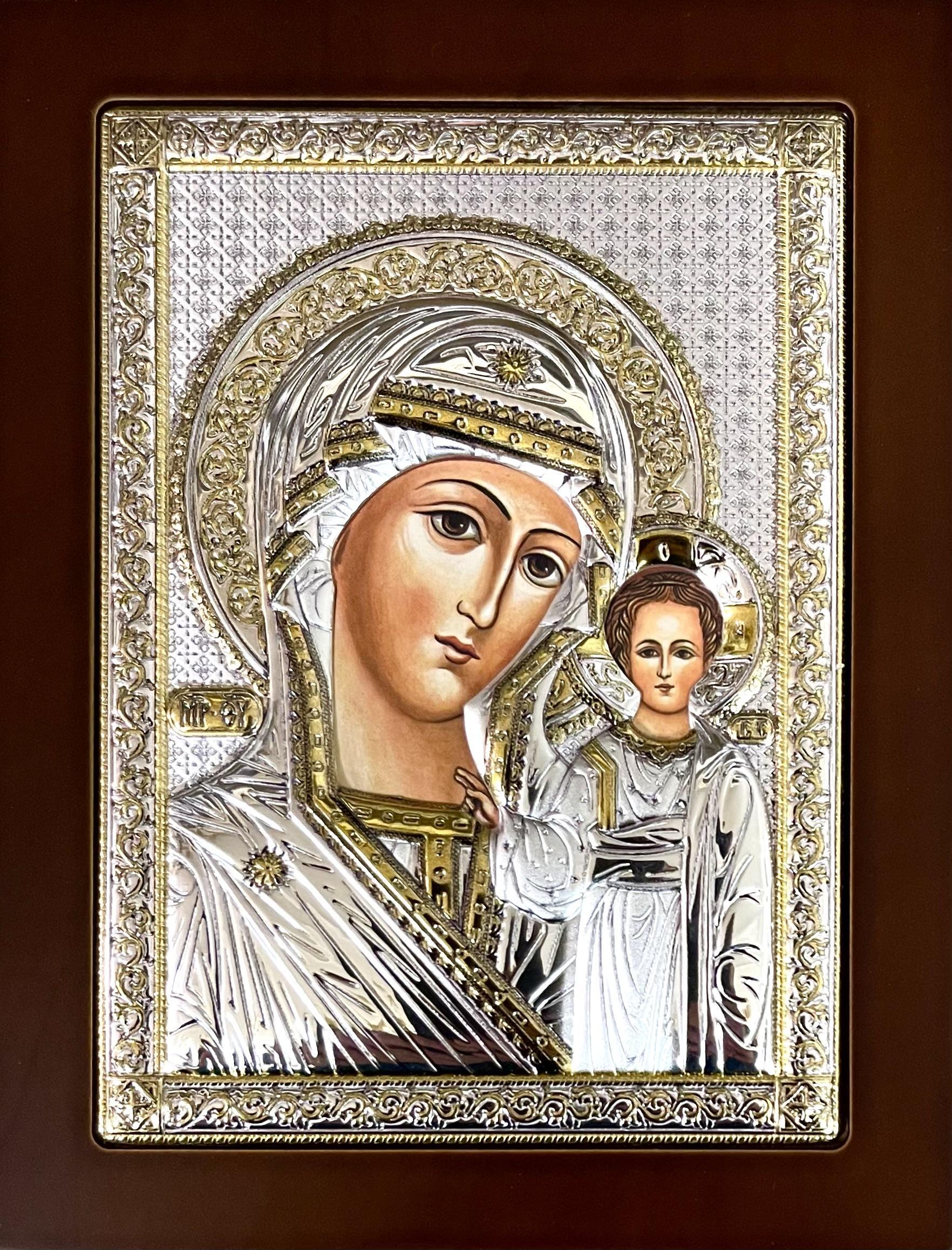 Icoană argintată  cu suport de lemn.