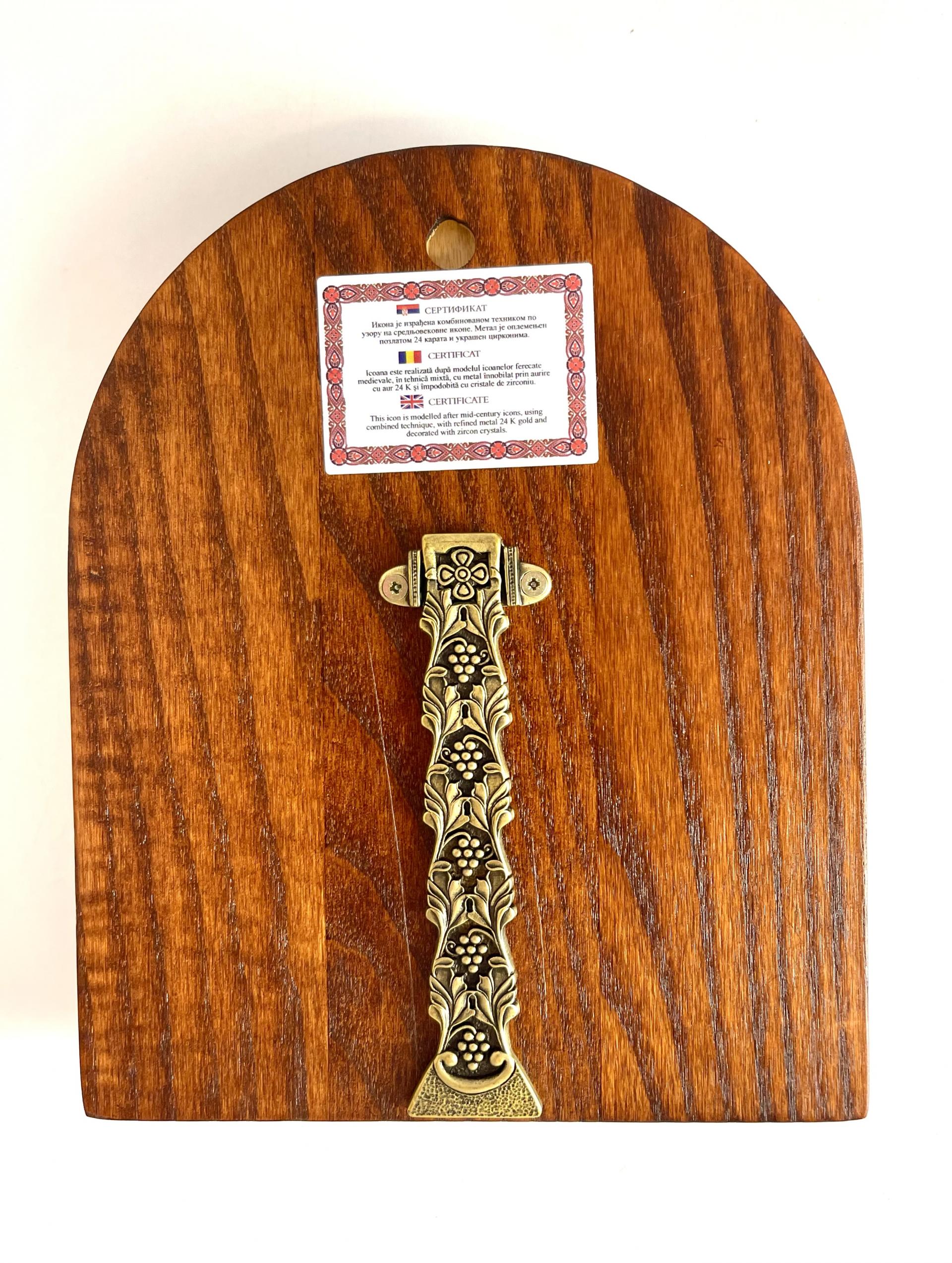 Icoană cu ferecătură metalică pe suport de lemn.