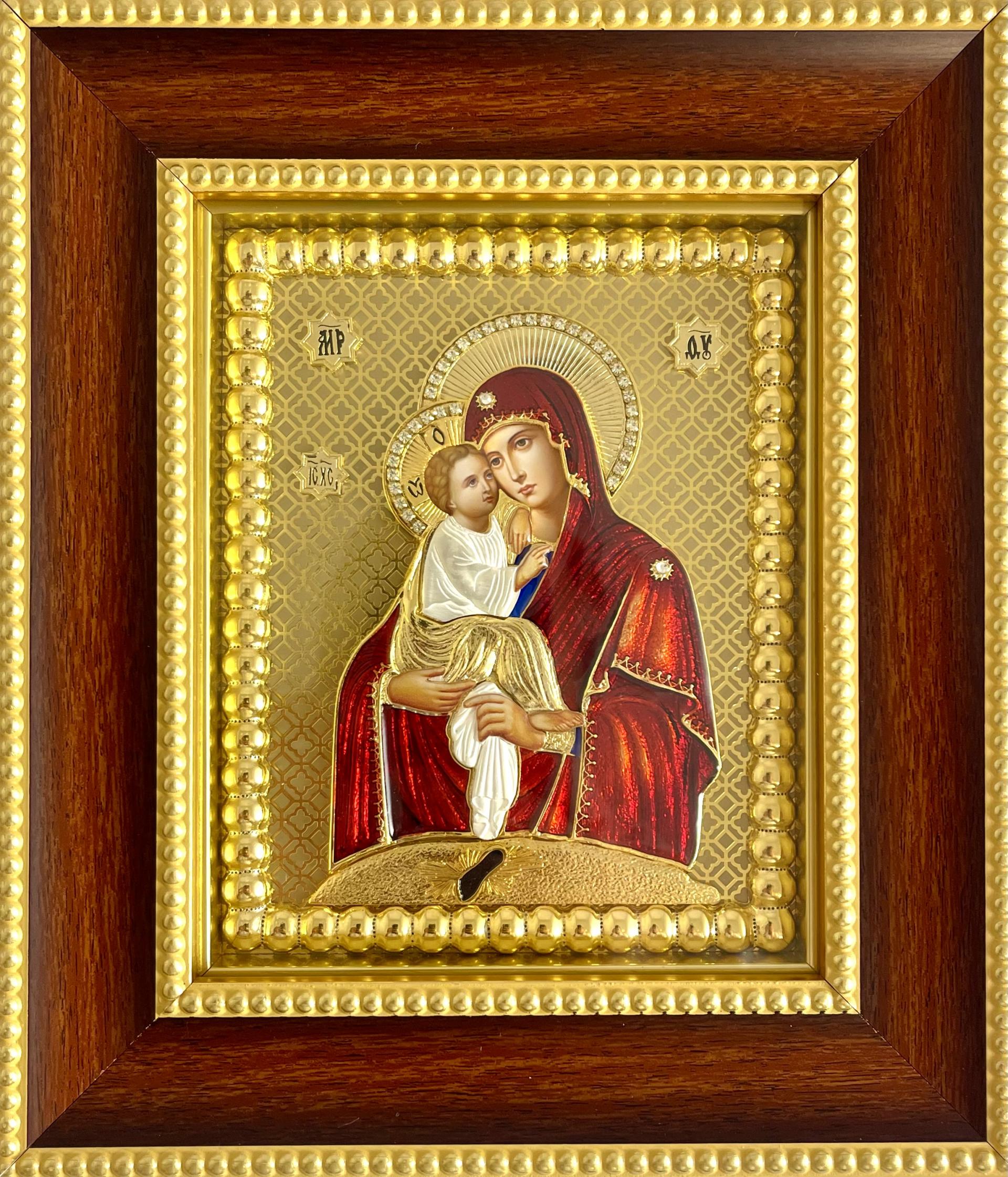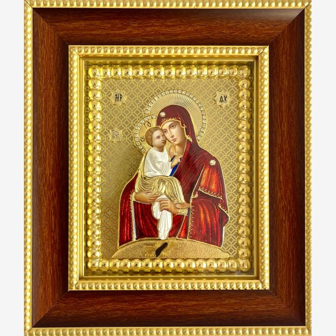 Icoană cu ferecătură metalică aurită si email. Rama este din lemn, icoana fiind protejată cu sticlă.